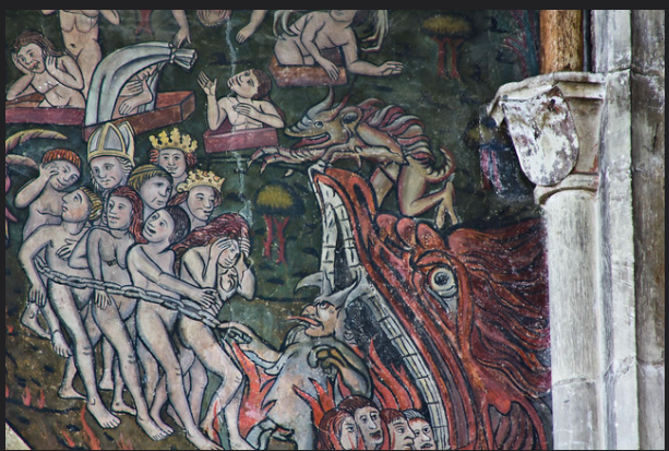 I arrive well into the lecture and make my way to the last row of desks under cover of darkness. The professor flips through slides of art depicting scenes of heaven and hell. Each image portrays good and evil in absolute terms of pleasure and pain, light and darkness. In one medieval triptych panel, an old man leads a naked woman with long brown tresses covering her naughty bits into the open maw of an enormous beast. She looks remarkably indifferent, her face expressionless even under the threat of eternal damnation. The old man—a serpent’s tongue darting through his teeth—leads her into the gates of Hell with the inscrutable mien of a meter maid writing out a citation. Their flat demeanors render the situation almost post-modern with disinterest. As the slide changes, I lean back against the wall, close my eyes and suck on a thin strand of hair.